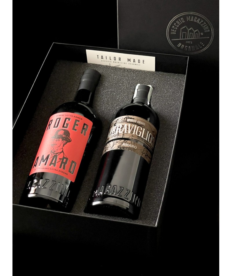 Maßgeschneiderte Auswahl aus zwei 70-cl-Flaschen: Roger Bitter Amaro Extra Strong und Meraviglioso Spirito Amaro.